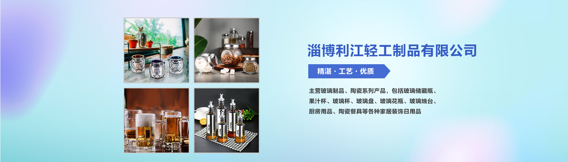 淄博利江輕工制品有限公司是一家集設(shè)計(jì)、研發(fā)、銷(xiāo)售于一體的日用玻璃器皿出口企業(yè),主營(yíng)玻璃制品、陶瓷系列產(chǎn)品,包括玻璃儲(chǔ)藏瓶、果汁杯、玻璃杯、玻璃盤(pán)、玻璃花瓶、玻璃燭臺(tái)、廚房用品、陶瓷餐具等各種家居裝飾日用品。公司成立于2002年,位于山東省淄博市高新區(qū)民泰路39號(hào),注冊(cè)資本貳佰萬(wàn)元,系中國(guó)輕工出口商會(huì)玻璃分會(huì)理事會(huì)員單位之一。公司占地面積十余畝,集辦公、展廳···